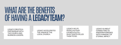 The Legacy Team is an outlet for those who are called and equipped to finance the Kingdom of God and to leave a legacy. The Legacy Team serves our church with the gift of giving.